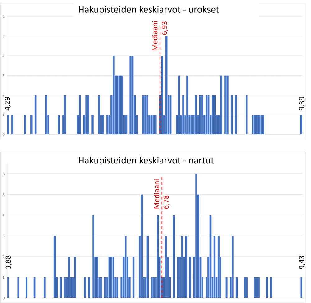 Hakupisteiden keskiarvoja kuvaavat histogrammit ovat sekä uroksilla että nartuilla suhteellisen symmetriset, mutta yllättäen melkein toistensa peilikuvat niin, että uroksista suurin massa sijoittuu hiukan mediaanin huonommalle puolelle narttujen tilanteen ollessa päinvastainen (kuva 1).