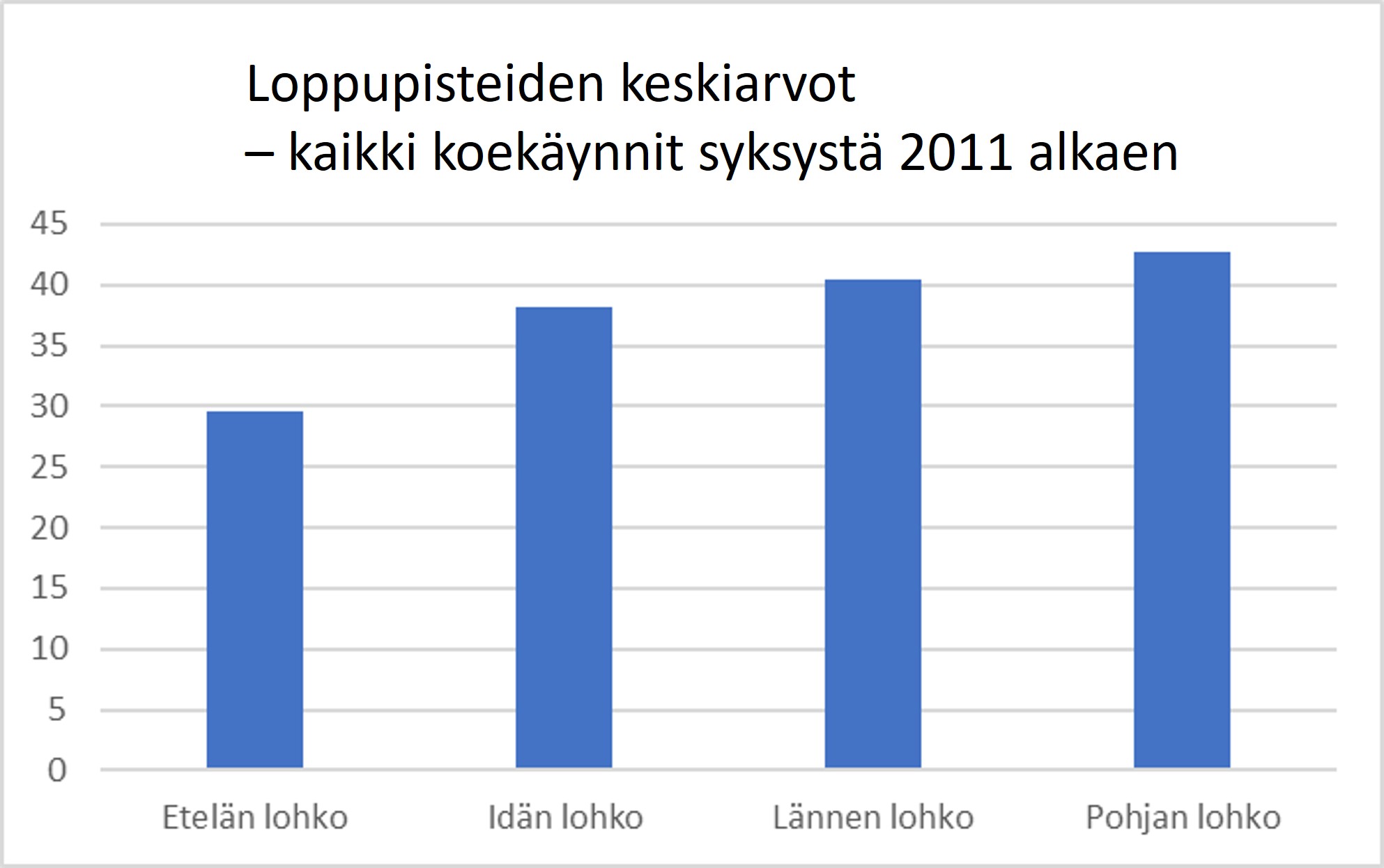 On merkillepantavaa, että pelkästään etelän lohkolla kokeissa käyneitä koiria ei läheltä diagrammien oikeaa reunaa löydy (ks. narttujen ja urosten listat). Syy siihen selviää tarkastelemalla kaikkien syksystä 2011 alkaen käytyjen kokeiden loppupisteiden jakautumista lohkojen välillä. Ero esimerkiksi etelän ja pohjan lohkojen välillä on n. 13 pistettä (kuva 2).