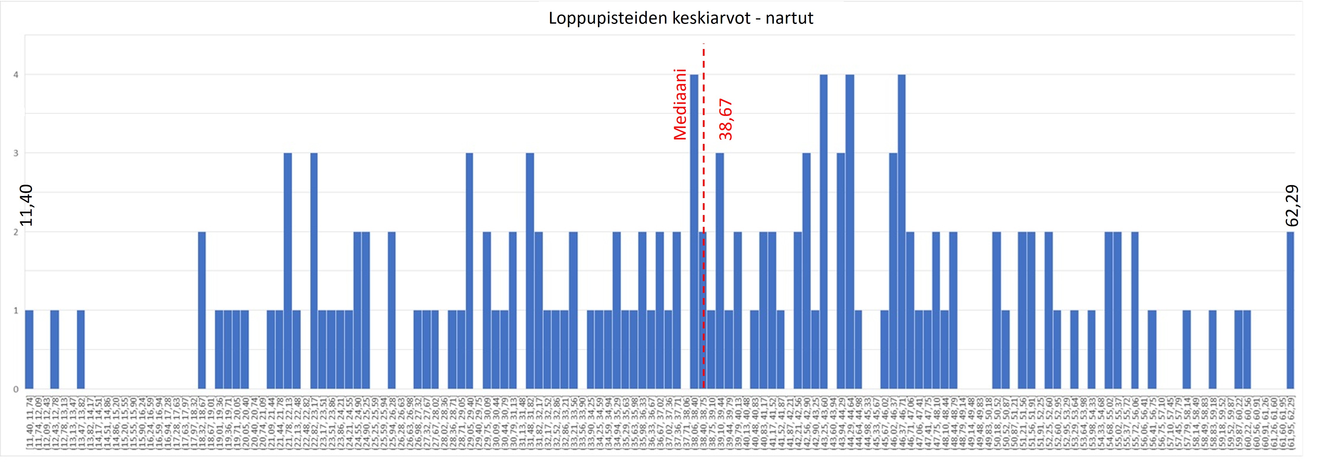 Sekä uroksilla, että nartuilla aineiston mediaani (keskimmäinen arvo) on 40 pisteen tuntumassa (punaiset katkoviivat). Hiukan niitä korkeammat pistekeskiarvot ovat vielä suhteellisen tavallisia, mutta 60 pisteen tuntumaan tai sen yli yltävät pistekeskiarvot ovat harvinaisia. Sellaisiin on yltänyt vain alle viisi prosenttia kaikista tarkastelussa mukana olleista koirista. Käyttö- ja kaksoisvaliokoirat painottuvat luonnollisesti histogrammien oikeaan reunaan.