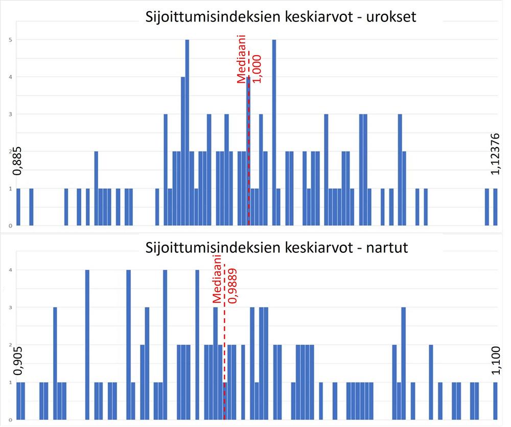Kuva 1. Sijoittumisindeksien keskiarvot uroksille ja nartuille. Varsinkin urosten kuvaaja on epäsymmetrinen ja koirat ovat jakautuneena vaaka-akselille epätasaisesti.
