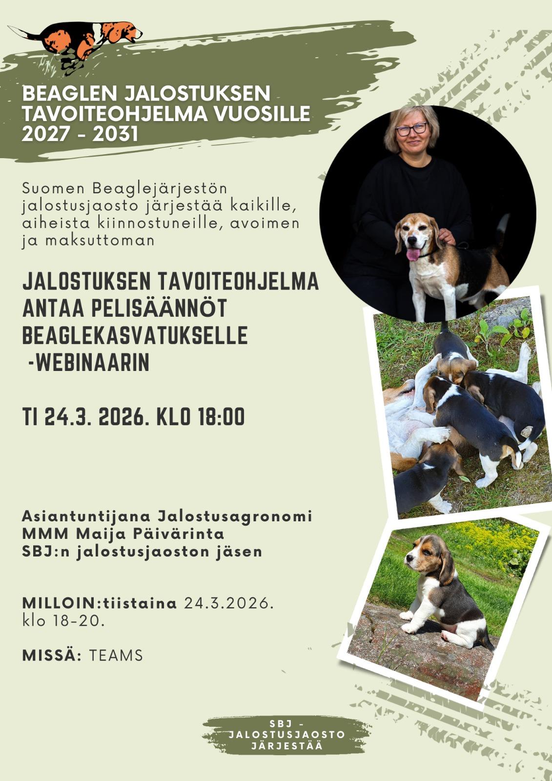 Jalostusjaosto pitää tiistaina 24.3.2026 klo 18 webinaarin, jossa käymme läpi ehdotuksen beaglen jalostuksen tavoiteohjelmaksi: mitä se pitää sisällään ja miksi se on tärkeä harrastajalle ja pennunostajalle sekä miten se vaikuttaa kasvattajan arkeen.